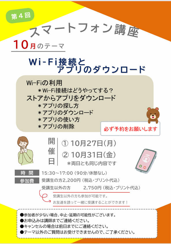 スマホ講座のご案内 10月 未分類 2025.10.07 7月からスタートしたスマホ講座ですが、10月はWi-Fiの設定方法、アプリのダウンロードなど皆さんが興味ある内容となっております。スマホ講座はどなたでも受講していただけますので沢山の方のご参加をお待ちしております。お問い合わせ先富士通オープンカレッジ米子校電話 0859-21-5821※お問い合わせはお電話をいただくか、各ページ画面上にある「お問い合わせ」をクリックすると表示されるメールフォームでも受け付けしております。 Post Views: 158