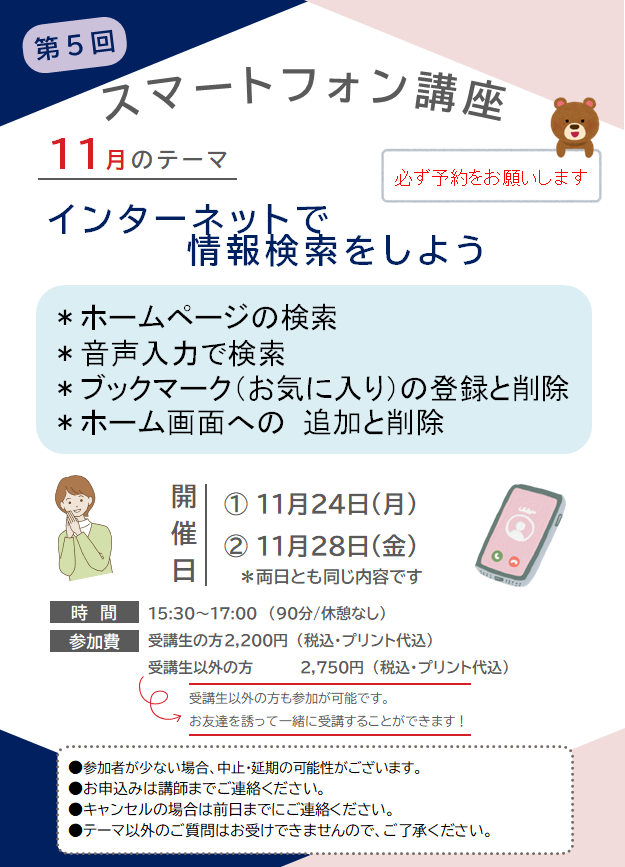 スマホ講座のご案内 11月 未分類 2025.11.02 毎月最終週に「スマホ講座」を実施しております。今月の内容は「インターネット」です。検索方法、気に入ったページの登録など、便利な使い方をご紹介します。受講生様以外の方でもお申込みいただけます。富士通オープンカレッジ米子校℡:0859-21-5821 Post Views: 129