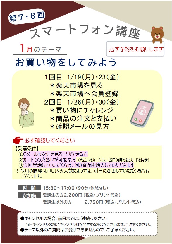 スマホ講座のご案内 1月 未分類 2026.01.08 今月のテーマは楽天市場を使い「お買い物」です。今回は「会員登録」と「お買い物」の2回です。1回目は19日(月)と23日(金) 楽天に会員登録2回目は26日(月)と30日(金) お買い物以下の内容を確認の上お申し込みください①Gメールを見ることができる方②カードでお支払いができる方③実際に買い物をしていただける方 受講生様以外の方もお申込みいただけますのでご興味ある方は下記電話番号までご連絡ください。富士通オープンカレッジ米子校℡:0859-21-5821 Post Views: 83